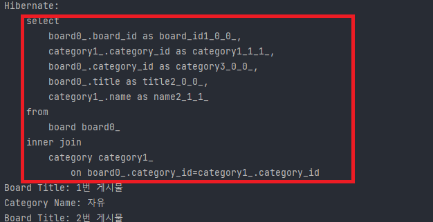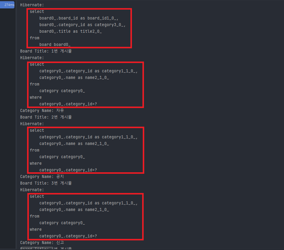 위 코드를 통해 Board 테이블을 조회했는데 카테고리 테이블에 대한 조회가 3건이나 추가로 발생한 것을 확인할 수 있습니다.