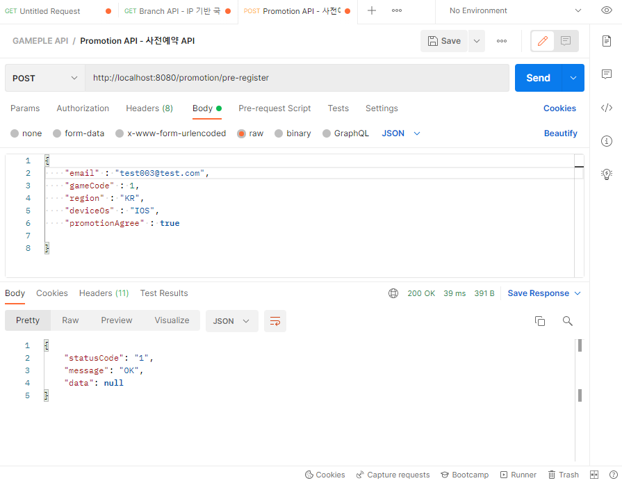 사전예약 API는 위 사진처럼 사전예약에 참가하고 싶은 사용자의 개인 정보와 같은 정보들을 입력받아 저장/등록하는 API입니다.
