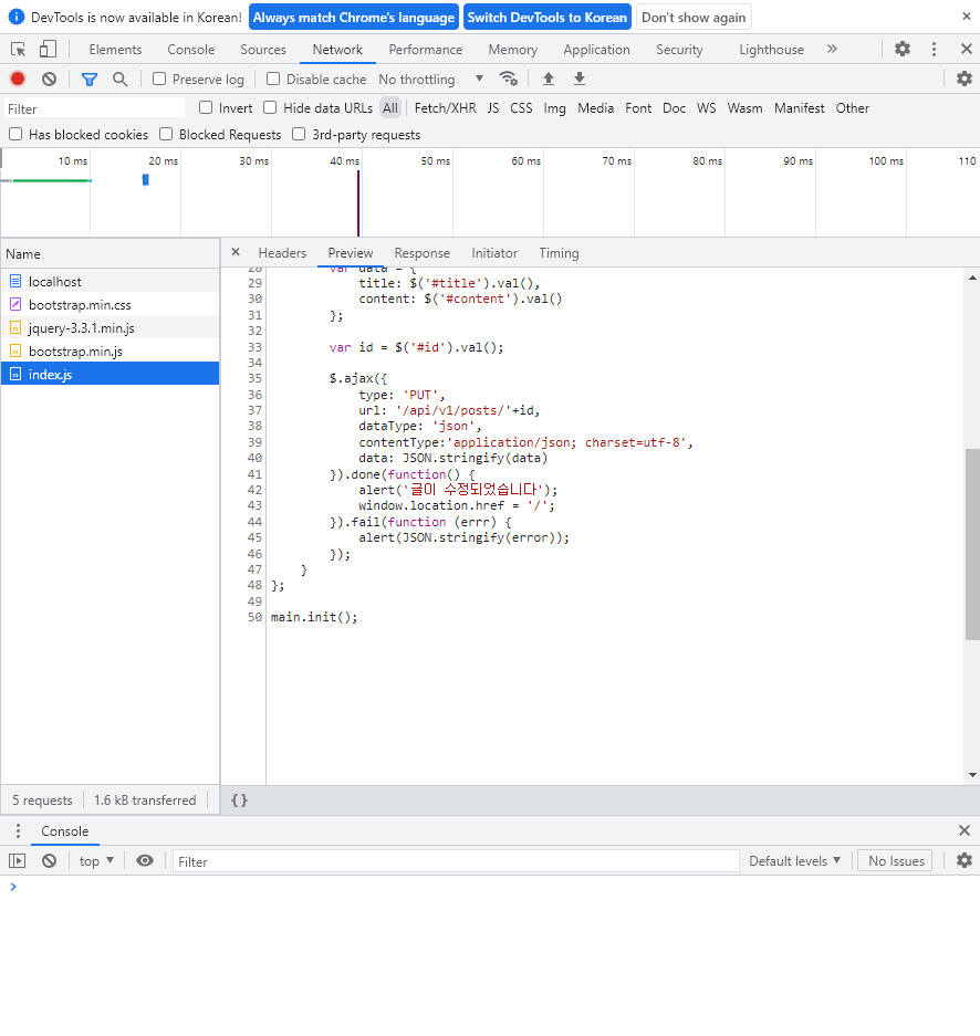 위의 3단계 스텝을 거친 후에 프로젝트를 다시 실행해보면 수정했던 JavaScript 코드가 정상적으로 적용됨을 확인할 수 있다.