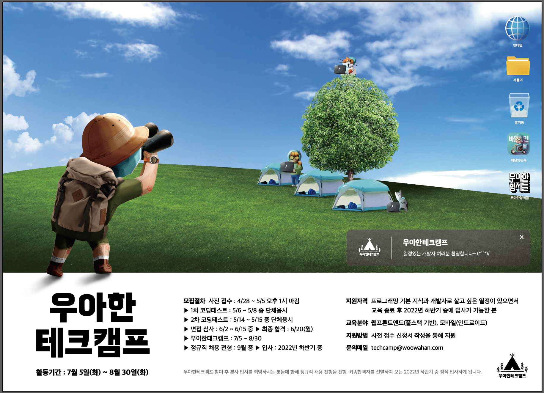 프로그래머스 문제를 풀다가 우아한테크캠프 5기 관련 배너를 보고 들어가보니 1차 코테를 간단한 접수 후에 바로 볼 수 있어서 보자마자 지원했다. 또한 코테를 한 번도 봐본적이 없다보니 어떤 문제 유형이 나오는지 궁금하기도 했고, 맨날 시간 생각 안하고 풀다보니 타임어택도 한 번 해보고 싶어서 지원했다.